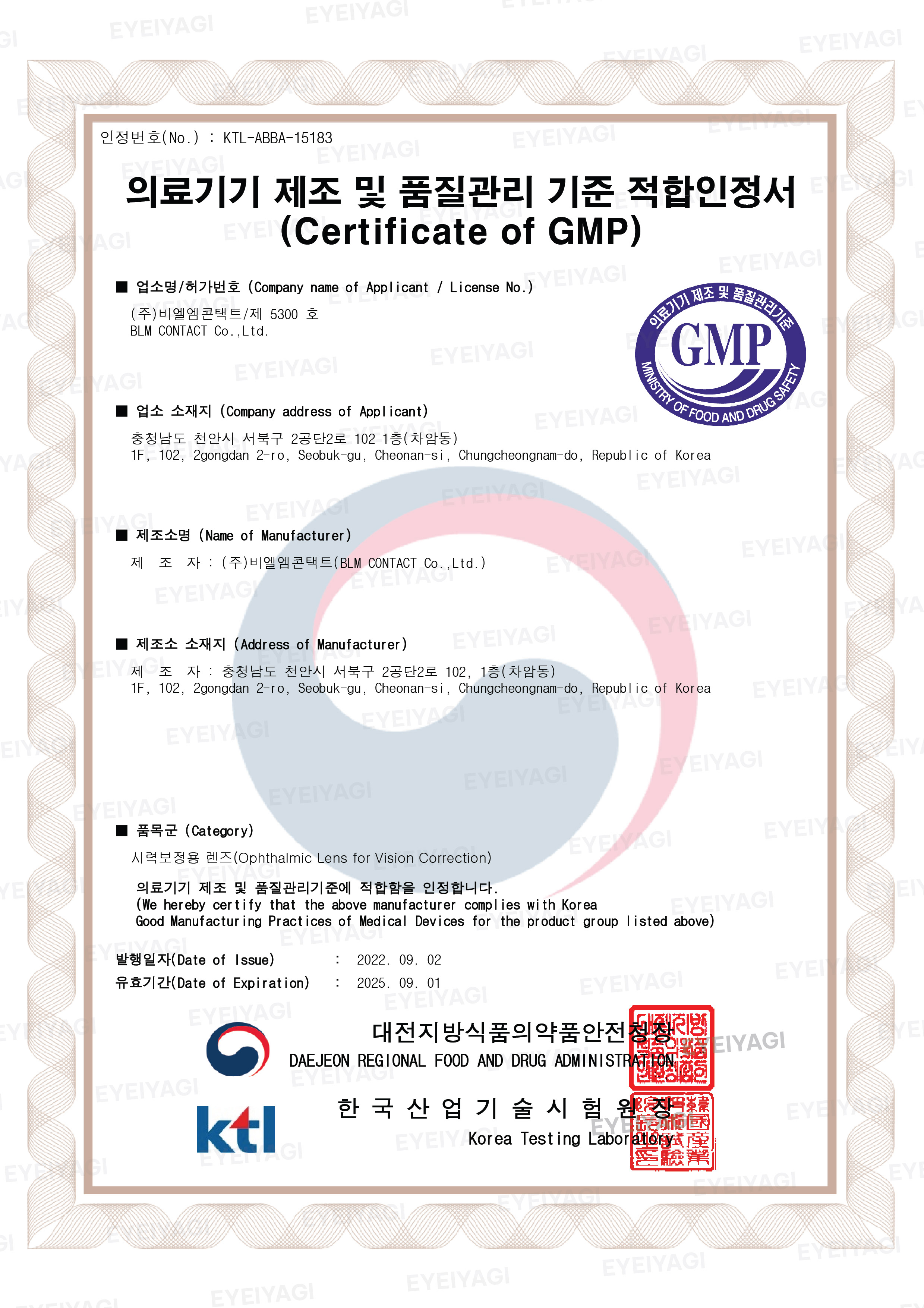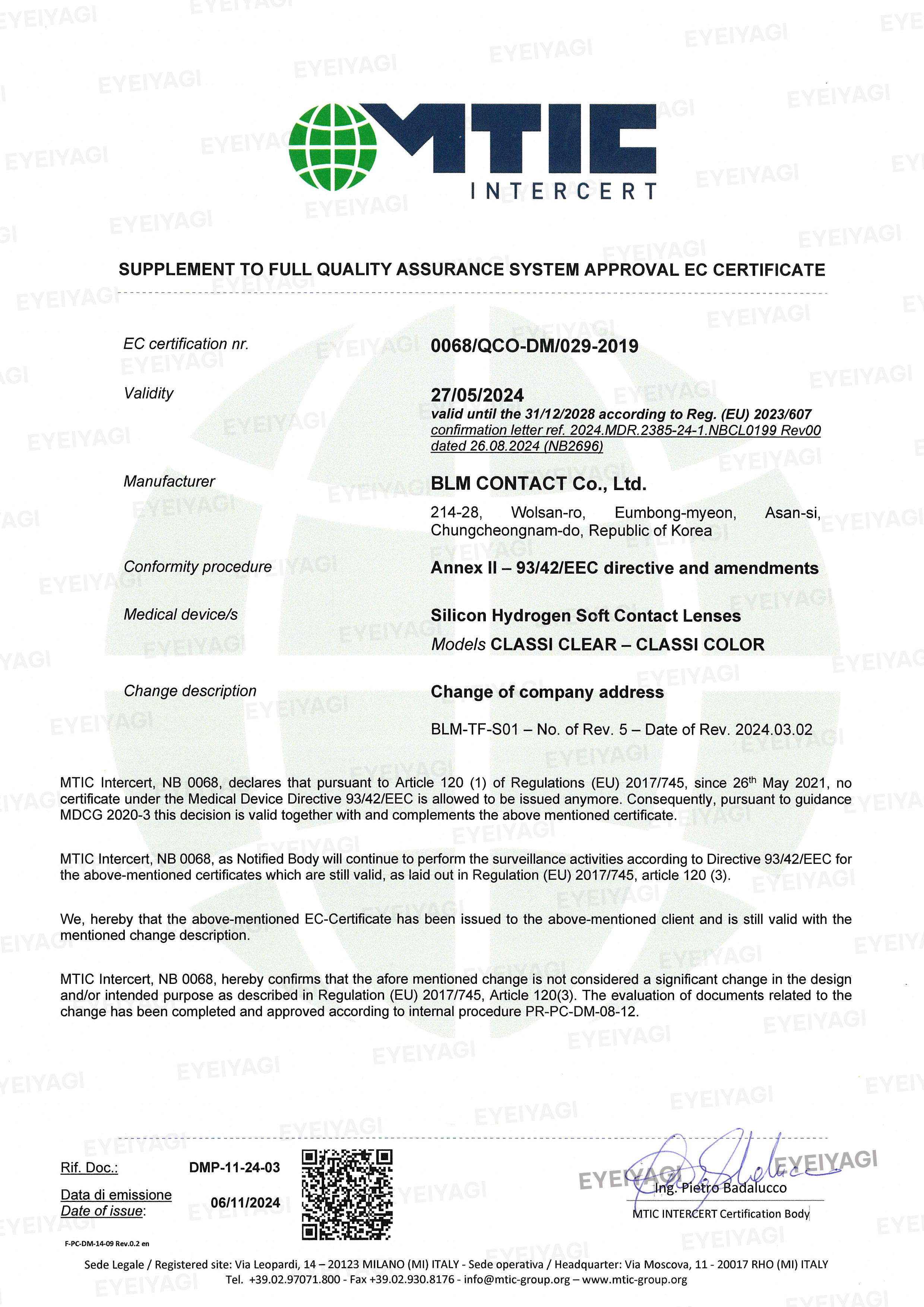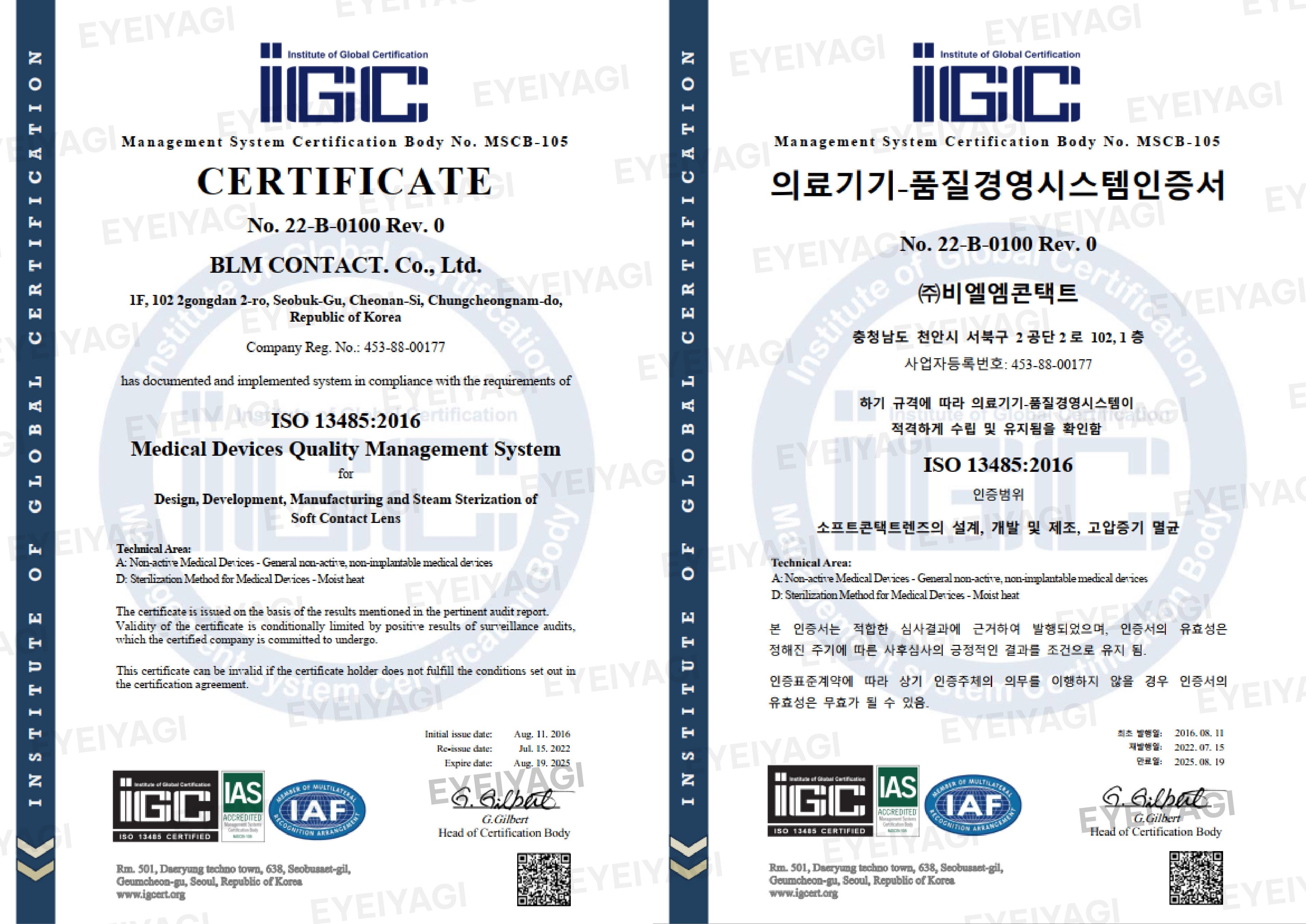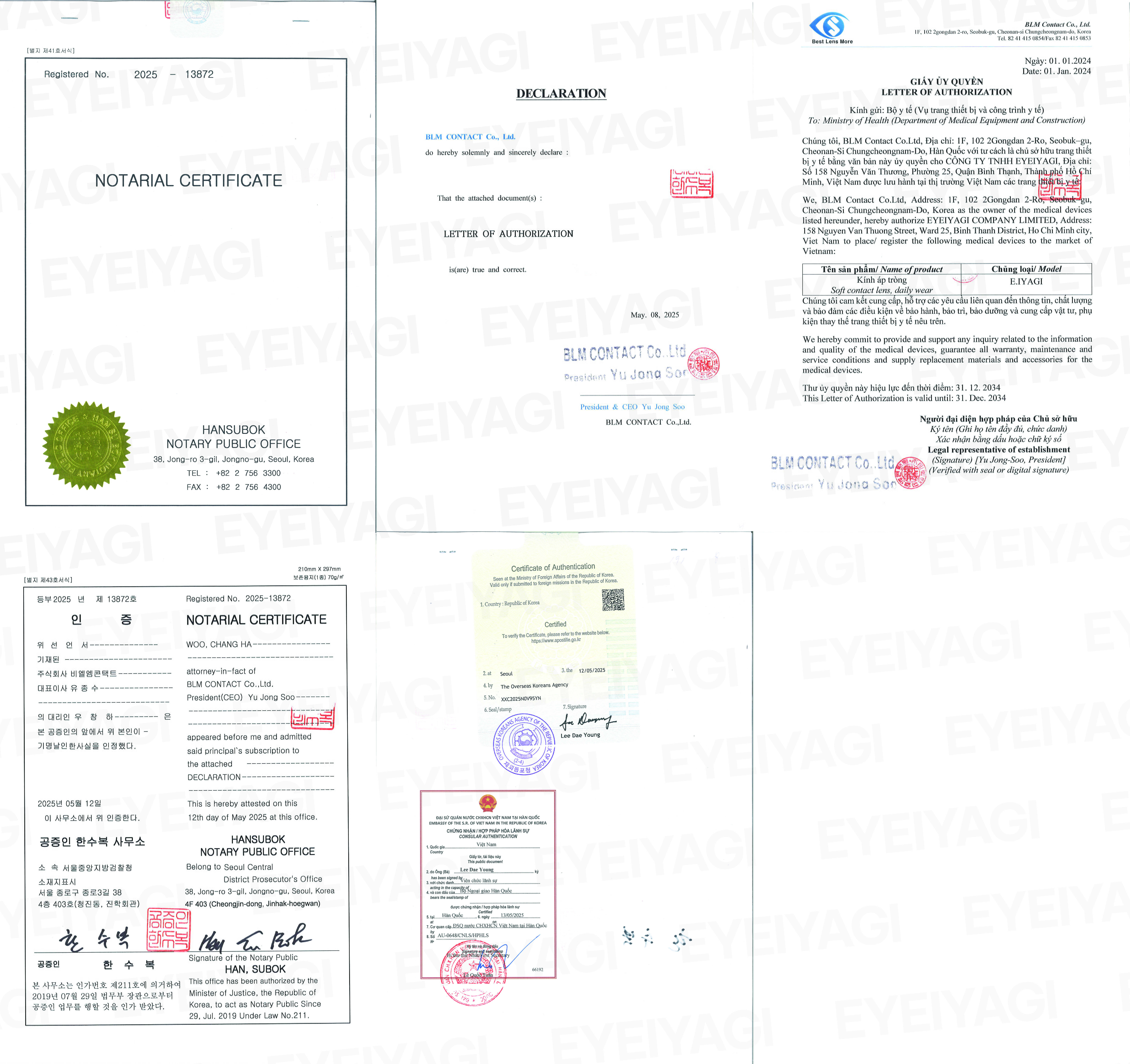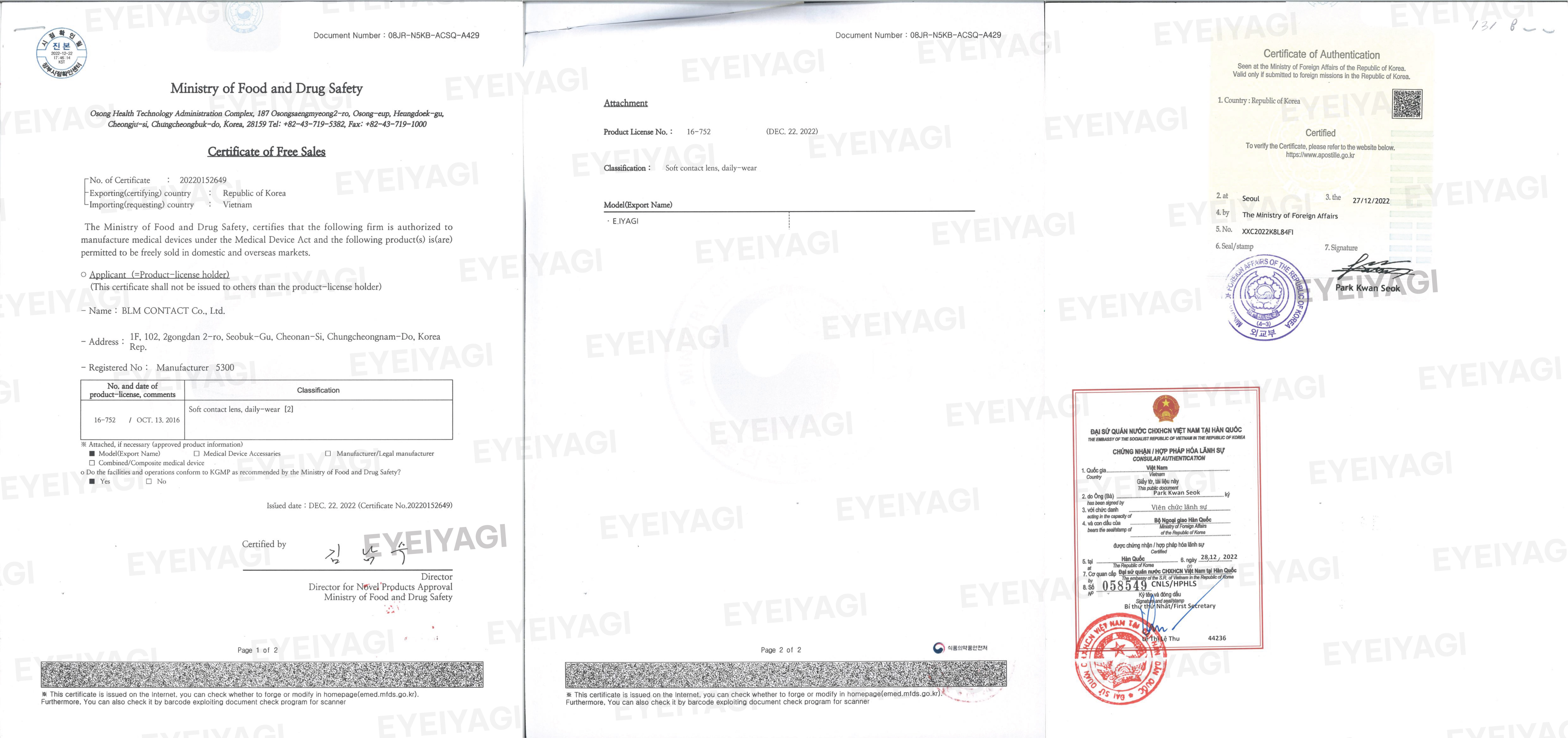 Dưới đây là hồ sơ pháp lý và các chứng nhận y tế quan trọng khẳng định chất lượng, xuất xứ, và tính an toàn của sản phẩm kính áp tròng Eyeiyagi: