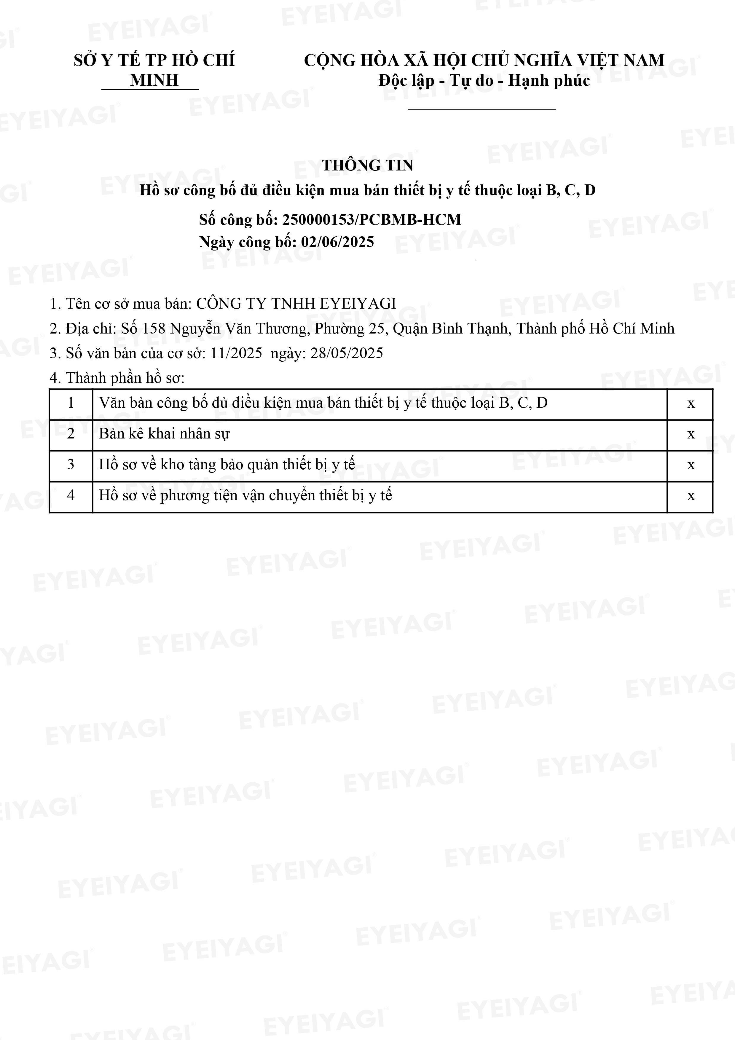 Sản phẩm kính áp tròng Eyeiyagi đã được Sở Y tế TP.HCM tiếp nhận hồ sơ công bố đủ điều kiện phân loại thiết bị y tế loại B – nhóm sản phẩm có mức độ rủi ro trung bình thấp, phù hợp với yêu cầu an toàn sử dụng cho người tiêu dùng.